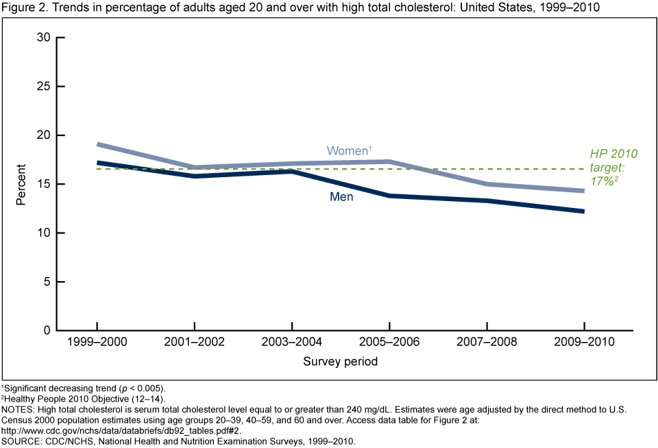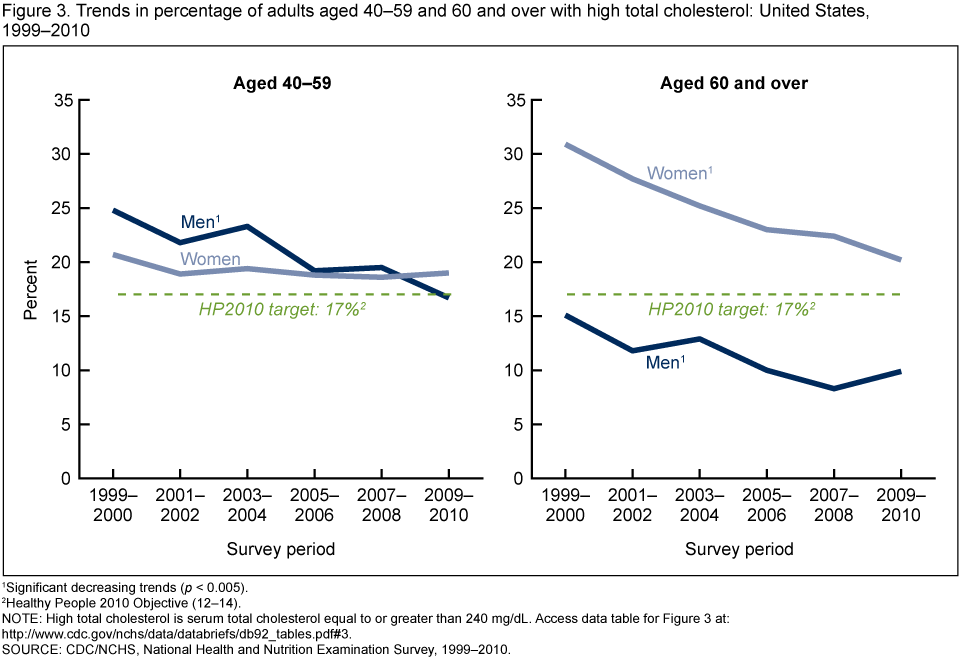 The percentage of adults aged 20 and over with high total cholesterol has declined substantially since 1999–2000. For 2009–2010, the percentage of adults with high total cholesterol was 13.4%, thus meeting the Healthy People 2010 target of 17% or less [Objective (12–14)] (7). Substantial and steady decreases in the prevalence of high total cholesterol among men aged 40 and over and women aged 60 and over during the 1999–2010 period resulted in achievement of the Healthy People 2010 objective in all sex and racial-and-ethnic groups and in all sex and age groups except for women aged 40 and over.
