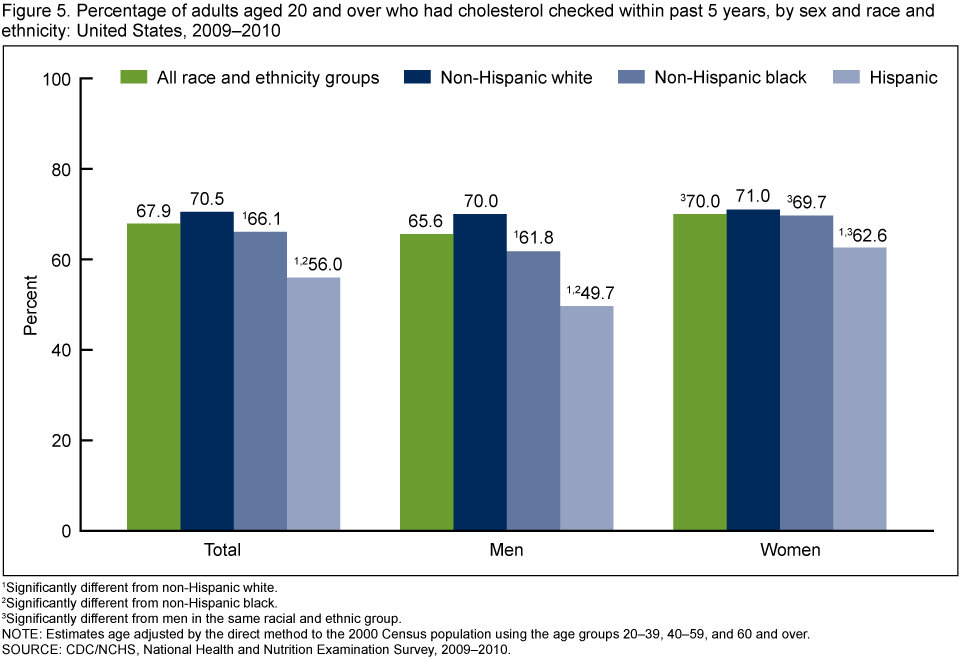 For 2009–2010, approximately 68.0% of adults aged 20 and over had their cholesterol checked within the preceding 5 years (Figure 5), including almost two-thirds of men (65.6%) and 70.0% of women. For both men and women, non-Hispanic white persons were more likely to have had their cholesterol checked within the past 5 years than Hispanic persons. Non-Hispanic white men were more likely to have been screened than non-Hispanic black men, who themselves were more likely to have been screened than Hispanic men. No difference in screening levels was observed between non-Hispanic white and non-Hispanic black women, nor between non-Hispanic black women and Hispanic women.