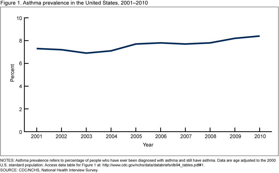 Akinbami LJ, Moorman JE, Bailey C, et al. Trends in asthma prevalence, health care use, and mortality in the United States, 2001–2010. NCHS data brief, no 94. Hyattsville, MD: National Center for Health Statistics. 2012.