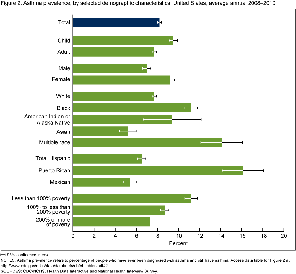- Asthma prevalence was higher among children, females, and those with family income below the poverty level, and differed by race and ethnicity for the period 2008–2010.
