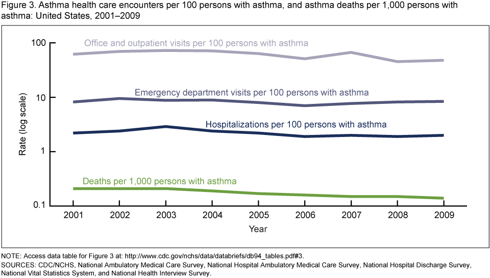 - From 2001 to 2009, health care visits for asthma per 100 persons with asthma declined in primary care settings, while asthma emergency department (ED) visit and hospitalization rates were stable.