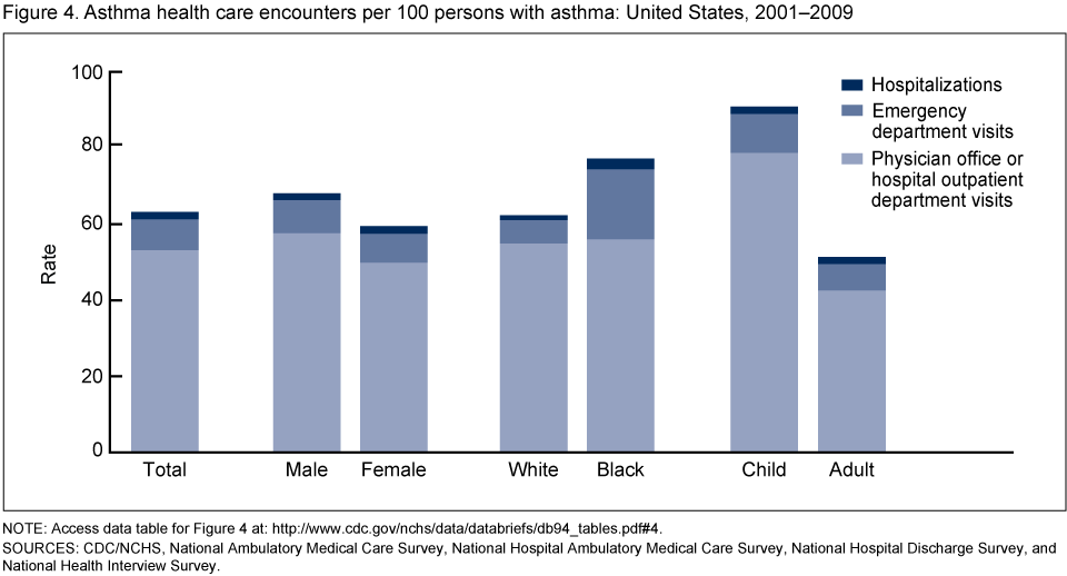 Asthma prevalence increased from 2001 to 2010: An estimated 25.7 million persons had asthma in 2010. Certain demographic groups had higher asthma prevalence: children aged 0–17 years, females, black persons, persons of multiple race, Puerto Rican persons, and persons with a family income below the poverty level. This report examines rates for asthma outcomes (health care encounters and death) for persons with asthma rather than for the general population. Rates for the general population represent the burden of asthma in the United States. Rates for the population with asthma take into account changes in asthma prevalence over time and differences in asthma prevalence among demographic groups. From 2001 to 2009, rates for ED visits and hospitalizations per 100 persons with asthma remained stable, while rates for asthma visits in primary care settings (physician offices or hospital outpatient departments) and asthma deaths declined. For the period 2007–2009, asthma visit rates (per 100 persons with asthma) in primary care settings for black persons were similar to those for white persons, but rates for asthma ED visits, hospitalizations, and death (per 1,000) were higher. Compared with adults, children aged 0–17 years had a higher rate for asthma visits in primary care settings and EDs, but had a similar hospitalization rate and a lower asthma death rate.