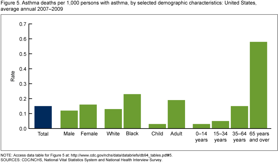 The asthma death rate per 1,000 persons with asthma was 0.15 for the period 2007–2009. Asthma death rates per 1,000 persons with asthma were more than 30% higher for females than males, 75% higher for black persons than white persons, and almost seven times higher for adults than children. The highest rate was for adults aged 65 and over (0.58 per 1,000 persons with asthma) (Figure 5).