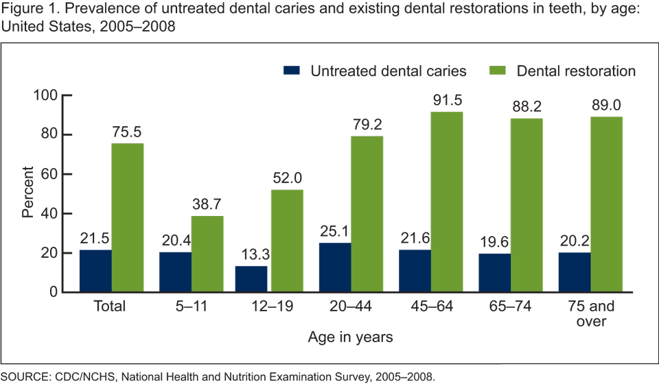 In 2005–2008, more than one in five people had untreated dental caries and three in four people had at least one dental restoration in the United States (Figure 1). Untreated dental caries among children aged 5–11 years was 20% and was 13% among adolescents aged 12–19. The prevalence of untreated caries among younger adults aged 20–44 was 25% and gradually decreased among the older age groups to approximately 20% for adults aged 65 and over. The prevalence of existing dental restorations increased as individuals aged from childhood into adulthood and plateaued in age groups starting at 45 and over. Thirty-nine percent of children aged 5–11 years and 52% of adolescents aged 12–19 had a dental restoration. The prevalence of having a dental restoration increased to 79% for adults aged 20–44 and then to nearly 92% for those aged 45–64. For older adults, dental restoration prevalence was 88% for those aged 65–74 and 89% for those aged 75 and over.