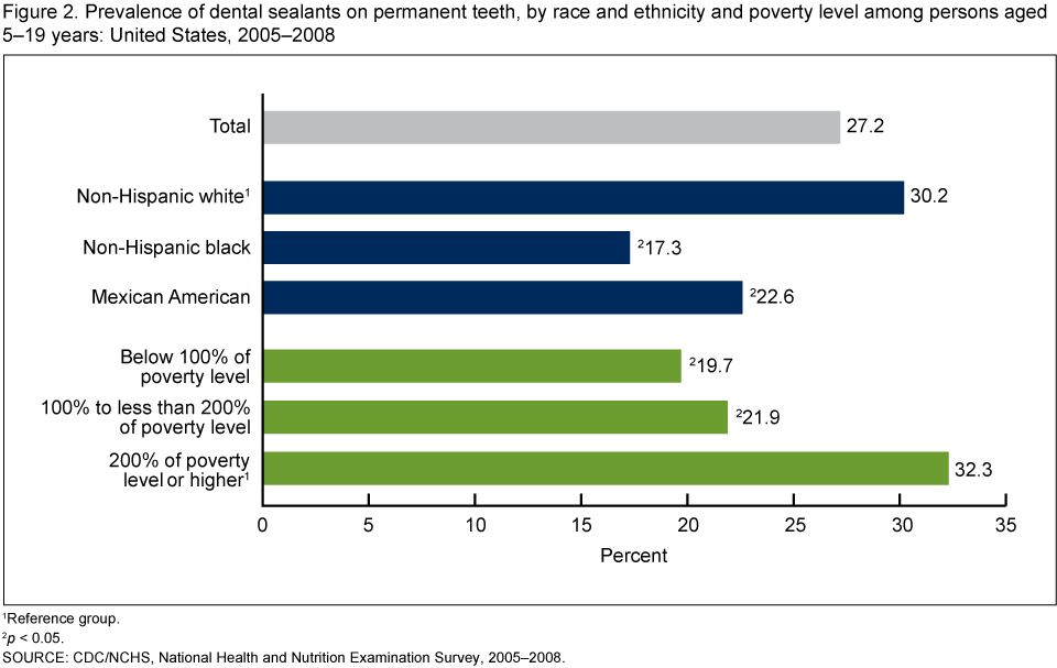 - Among children and adolescents aged 5–19 years, dental sealant prevalence was highest among non-Hispanic white persons and those living at 200% or more of the poverty level.