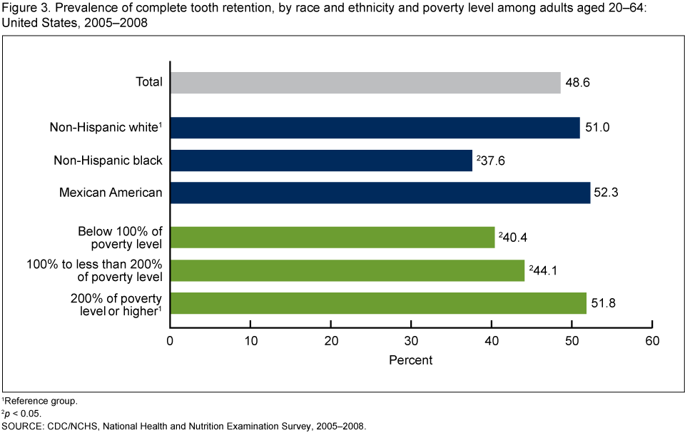 - More non-Hispanic white and Mexican-American adults had retained all of their permanent teeth compared with non-Hispanic black adults.
