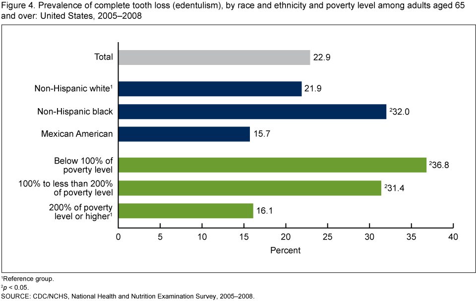 - Edentulism was significantly higher among older adults living in poverty compared with those living at 200% of the poverty level or higher.