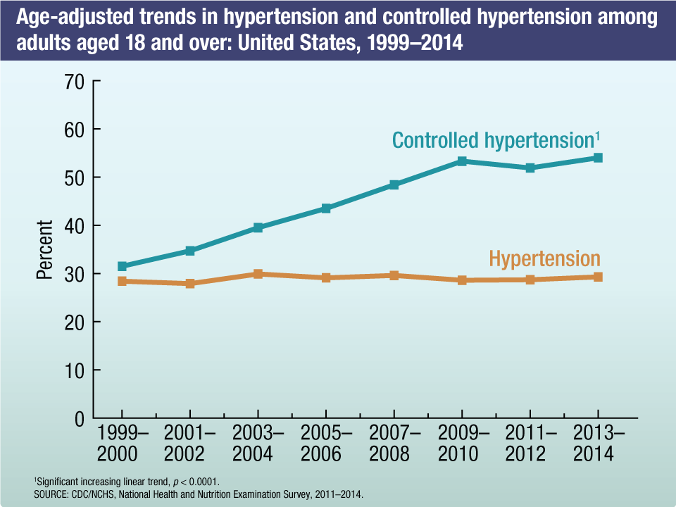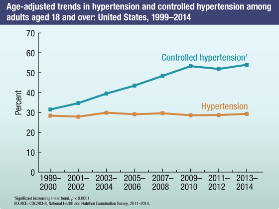 - From 1999 through 2014, a significant increase was noted in the percentage of adults with controlled hypertension, that is, individuals with physician-diagnosed hypertension whose blood pressure was in normal range at the time of the examination. But no significant change was noted from 2009 through 2014.
