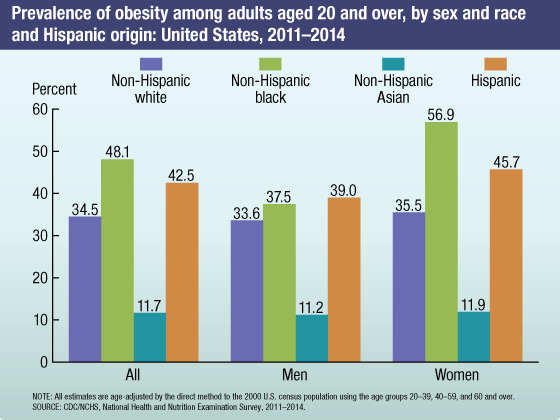 - The prevalence of obesity was 11.9% in non-Hispanic Asian, 35.5% in non-Hispanic white, 45.7% in Hispanic, and 56.9% in non-Hispanic black women.