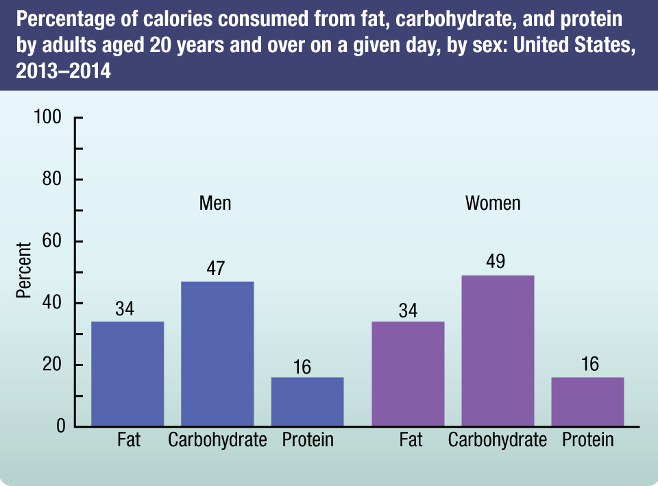 Percentage of calories consumed from fat, carbohydrate, and protein by adults aged 20 years and over on a given day, by sex: United States, 2013–2014