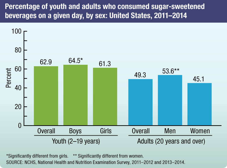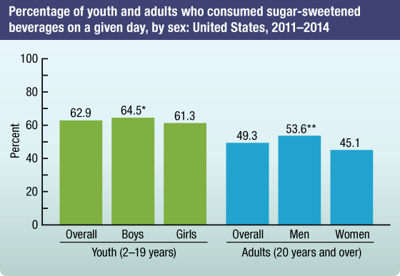 - Almost two-thirds of U.S. youth 2–19 years of age and approximately one-half of adults aged 20 years and over consumed at least one sugar-sweetened beverage on a given day in 2011–2014. The consumption of sugar-sweetened beverages was more common among males compared with females among both adults and children.