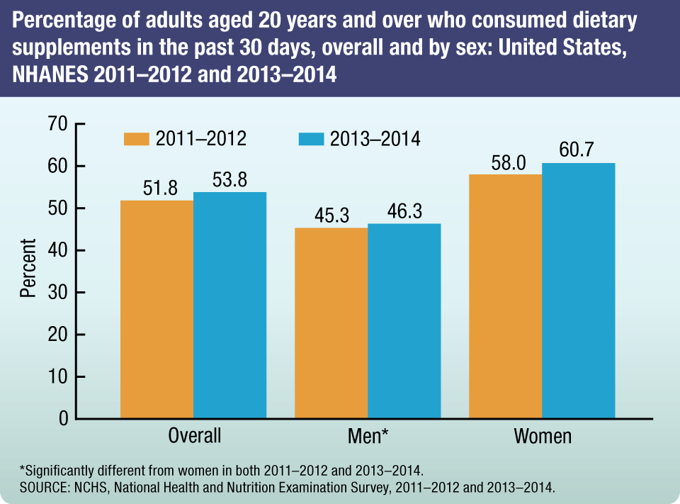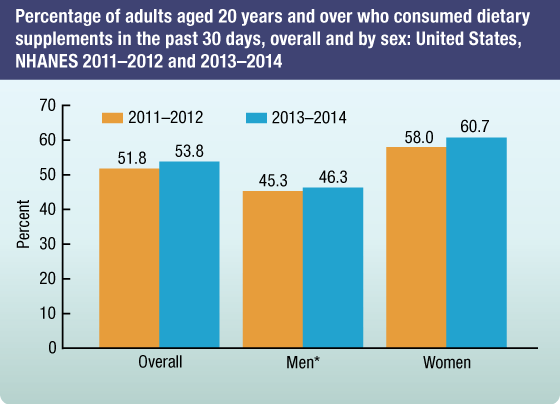 NHANES data from 2013–2014 show that a little more than half of adults 20 years and over (54%) reported consuming at least one dietary supplement in the past 30 days.