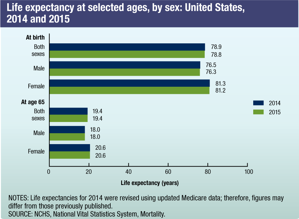• In 2015, life expectancy at birth was 78.8 years for the total U.S. population—a decrease of 0.1 year from 78.9 years in 2014. For males, life expectancy changed from 76.5 years in 2014 to 76.3 years in 2015—a decrease of 0.2 years. For females, life expectancy decreased 0.1 year from 81.3 years in 2014 to 81.2 years in 2015. Life expectancy for females was consistently higher than it was for males.
