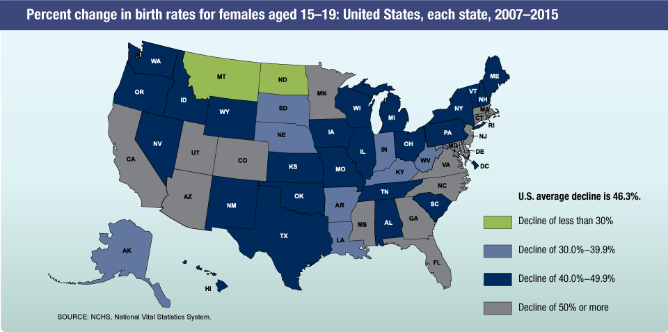 • The birth rate for teenagers declined to another historic low for the United States in 2015, down 8% from 2014 to 22.3 births per 1,000 females aged 15–19.