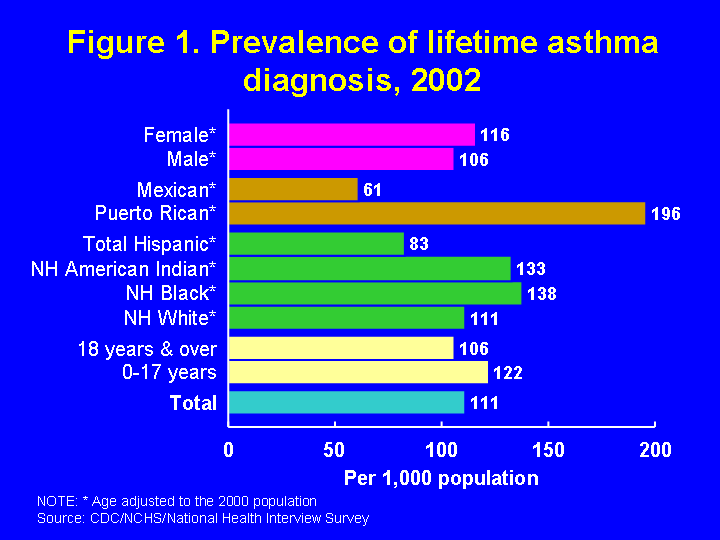 The burden from asthma in the United States has increased over the past 2 decades. Trends from 1980 to 1999 are presented in the CDC Asthma Surveillance Survey. This fact sheet presents the most recent national data on asthma gathered by the National Center for Health Statistics. Estimates for race/ethnicity and gender are age adjusted to the 2000 population standard to allow comparison of rates between groups.