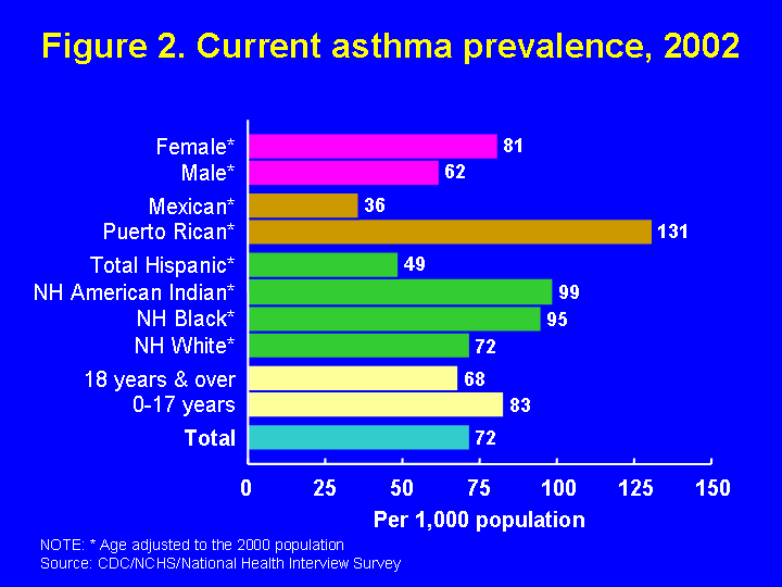 Estimates of current asthma prevalence include people who have been diagnosed with asthma by a health professional and who still have asthma. In 2002, 72 people per 1,000 or 20 million people, currently had asthma (Figure 2). Rates decreased with age; 83 per 1,000 children 0-17 years (6.1 million children) had asthma compared to 68 per 1,000 adults 18 years and over (14 million adults). When race/ethnicity is considered, Puerto Ricans had current asthma prevalence 80% higher than non-Hispanic whites, and non-Hispanic blacks and American Indians had current asthma prevalence 30% higher than non-Hispanic whites. The overall estimate for Hispanics masks the high prevalence among Puerto Ricans. Females had a 30% higher prevalence compared to males. However, this pattern was reversed among children. The current asthma prevalence rate for boys aged 0-17 years (94 per 1,000) was 30% higher than the rate among girls (71 per 1,000).