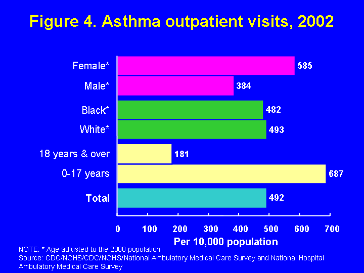 There were 1.9 million visits to EDs for asthma in 2002, or 67 per 10,000 people (Figure 5). Children aged 0-17 years had over 727,000 ED visits, a rate of 100 per 10,000. The ED visit rate was highest among children aged 0-4 years at 162 per 10,000. Adults 18 years and over had 24 ED visits per 10,000. The ED visit rate for blacks was 380% higher than that for whites, and for females, about 6% higher than for males.
