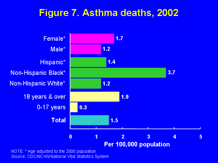 In 2002, 4,261 people died from asthma, or 1.5 per 100,000 people (Figure 7). Among children, asthma deaths are rare. In 2002, 187 children aged 0-17 years died from asthma, or 0.3 deaths per 100,000 children compared to 1.9 deaths per 100,000 adults aged 18 and over. Non-Hispanic blacks were the most likely to die from asthma, and had an asthma death rate over 200% higher than non-Hispanic whites and 160% higher than Hispanics. National estimates for Hispanic subgroups, such as Puerto Ricans and Mexicans, are not available. Females had an asthma death rate about 40% higher than males.