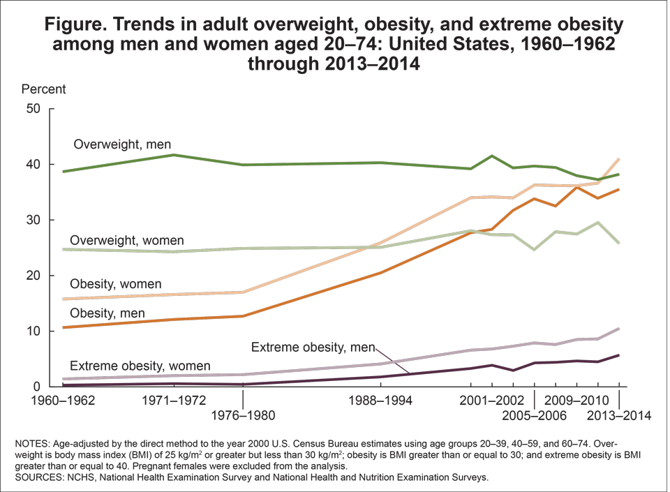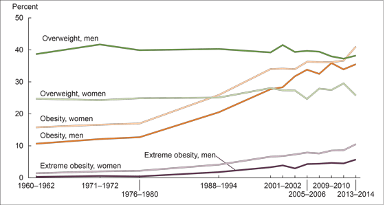 Prevalence of Overweight, Obesity, and Extreme Obesity Among Adults Aged 20 and Over: United States, 1960–1962 Through 2013–2014