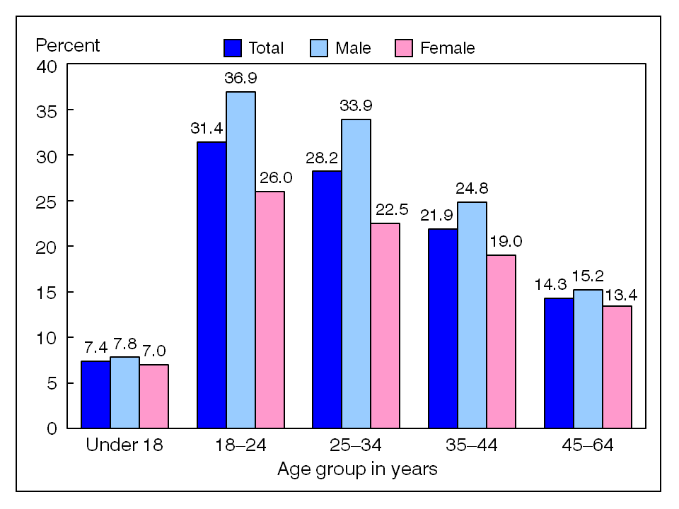 | 18-64 years | 21.5 (0.65) | 26.2 (0.70) | 16.0 (0.58) |