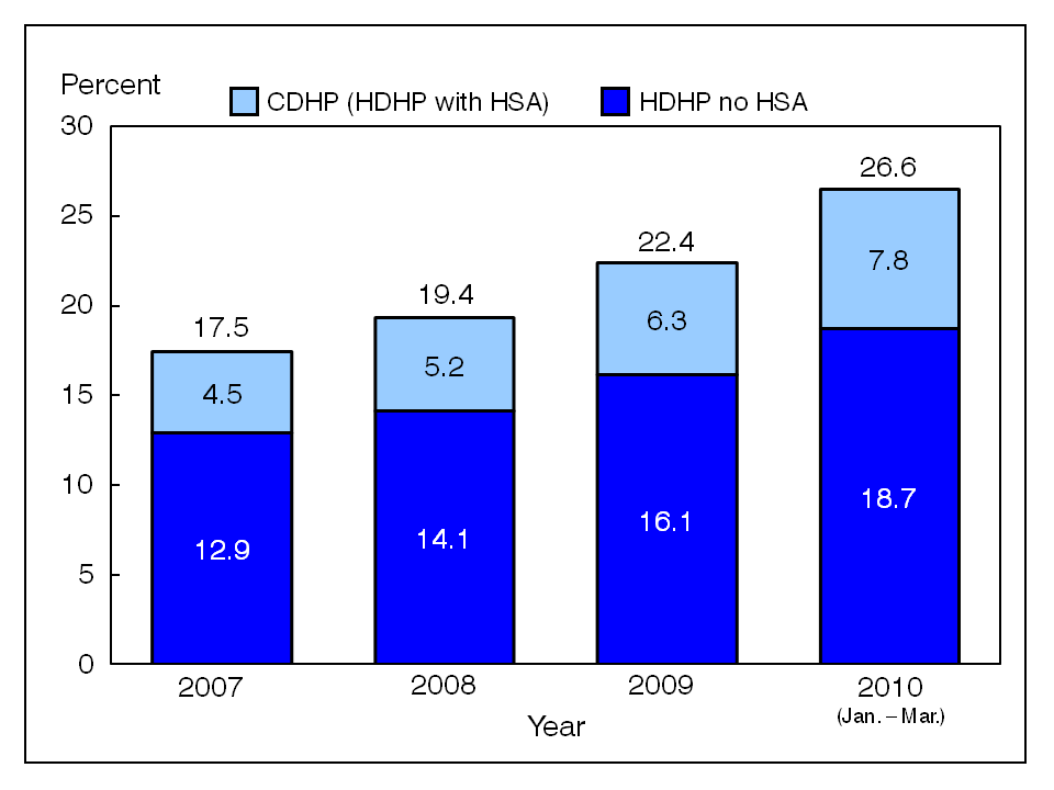- During the first 3 months of 2010, 26.6% of persons under age 65 years with private health insurance at the time of interview were enrolled in a high deductible health plan (HDHP), including 7.8% who were enrolled in a consumer-directed health plan (CDHP). More than 50% of persons with a private plan obtained by means other than through employment were enrolled in a HDHP. An estimated 21.7% of persons with a private plan were in a family with a flexible spending account (FSA) for medical expenses.