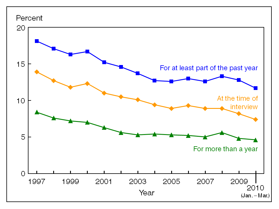 The percentage of children who were uninsured during at least part of the year prior to interview decreased from 18.1% in 1997 to 11.7% in the first 3 months of 2010 (Figure 6). However, since 2003 the percentage of children uninsured during at least part of the year prior to interview has remained relatively stable and has ranged from 11.7% to 13.7%. From 1997 through the first 3 months of 2010, the percentage of adults aged 18-64 who lacked coverage for at least part of the year prior to interview ranged between 22.2% in 1999 to 26.2% in the first 3 months of 2010 (Figure 7 and Table 1). However, there has been a general increasing trend in the percentage of adults aged 18-64 who lacked coverage for at least part of the year from 1997 through the first 3 months of 2010.
