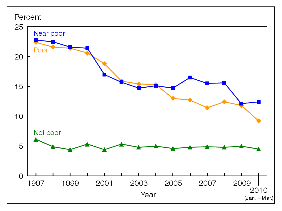 1Poverty status is based on family income and family size, using the U.S. Census Bureau’s poverty thresholds. “Poor” persons are defined as those below the poverty threshold; “near poor” persons have incomes of 100% to less than 200% of the poverty threshold; and “not poor” persons have incomes of 200% of the poverty threshold or greater. The percentage of respondents with unknown poverty status was 19.1% in 1997, 23.6% in 1998, 26.4% in 1999, 27.0% in 2000, 27.1% in 2001, 28.1% in 2002, 31.5% in 2003, 29.6% in 2004, 28.9% in 2005, 30.7% in 2006, 18.0% in 2007, 15.8% in 2008, and 12.3% in 2009 and 11.1% in the first quarter of 2010. For more information on the unknown income and poverty status categories, see the National Health Interview Survey (NHIS) Survey Description Document for years 1997-2005, available from the NHIS website. Estimates may differ from estimates based on both reported and imputed income. See “Technical Notes ” for a discussion of the use of imputed income in the stratification of health insurance coverage by poverty status.
