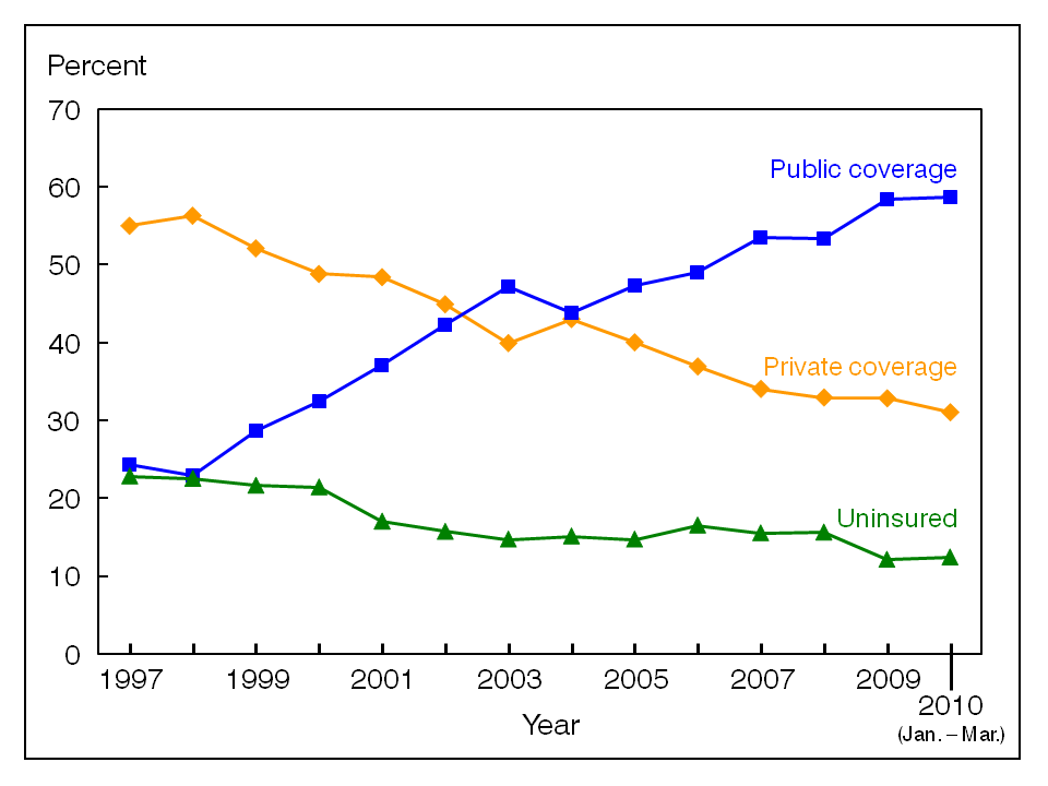 Public coverage rates among both children and adults aged 18-64 years are higher now than in 1997. However, the increase among adults is smaller than the increase among children (Table 3). Public coverage for children has almost doubled, from 20.0% in 1998 to 38.4% in the first 3 months of 2010. Conversely, private health care coverage rates among both children and adults aged 18-64 are lower now than in 1997.