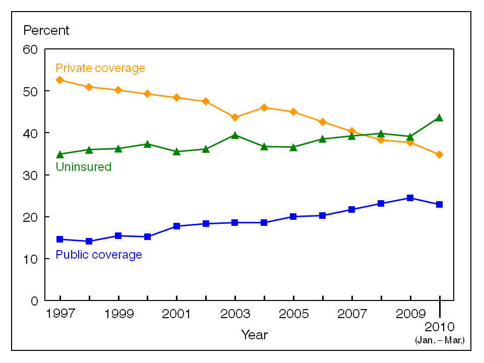 - Private coverage decreased among near poor adults aged 18-64 years, from 52.6% in 1997 to 34.8% in the first 3 months of 2010, so that the uninsured rate (43.7%) is now higher than the private coverage rate (34.8%) for this population