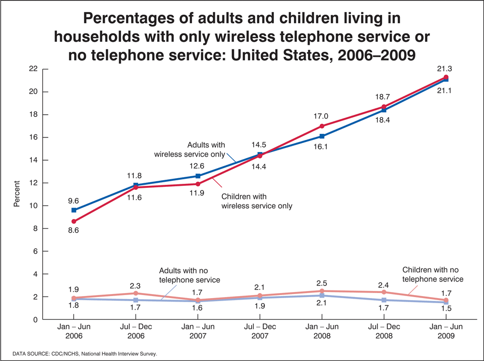 Blumberg SJ, Luke JV. Wireless substitution: Early release of estimates from the National Health Interview Survey, January-June 2009. National Center for Health Statistics. December 2009. Available from: /nchs/nhis.htm.