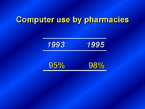 The goal in objective 12.5 is to increase the use of linked computer systems in pharmacies to alert us to potential drug interactions or hazardous or ineffective drug combinations. As you can see in this first slide, the use of computers is at a very high level in pharmacies--98 percent in 1995. Unfortunately, while the computer capabilities may be in place in individual pharmacies, we don't have specific data to assess the extent to which linked systems are in place to inform pharmacists and protect patients.