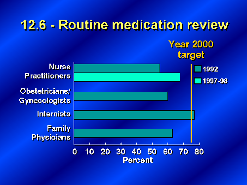 Of course critical to the safe and effective use of medications, is the careful and systematic review of those medications by a patient's medical team. Objective 12.6 established a target of 75 percent of primary care providers routinely reviewing with their older patients all prescribed and over-the-counter medicines each time a new medication is prescribed. Early in this decade, internists had already met this target but for other health providers only about 50 to 60 percent were conducting this important medication review. Since that time we have new data to show an improvement by nurse practitioners and hope that this encouraging sign indicates that other health providers are doing so as well.