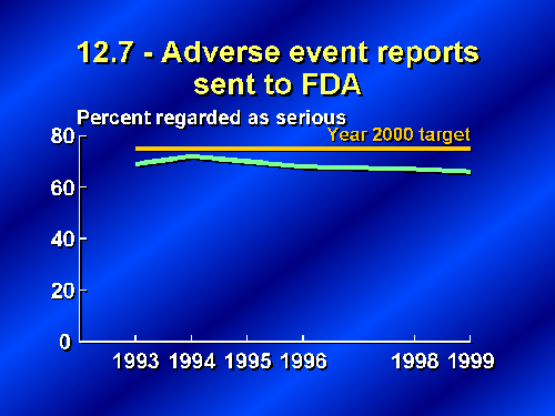 Our next slide shows data from FDA's MedWatch, a program that monitors adverse reactions to drugs and other medical products. FDA has established detailed criteria for serious adverse events -- such as a life-threatening situation, a permanent disability, or death -- and has requested that only these serious reactions be reported under the voluntary system. This slide shows the percent of serious adverse events among the reports from health professionals and consumers that comprise the voluntary system -- about 8 percent of the total reports to MedWatch. Objective 12.7 aimed at increasing the reporting of serious adverse events to 75 percent of all voluntary reports. Data through May 1999 show that the proportion of serious events has dropped slightly as a total of all reported events and is below the target. We'll hear more about MedWatch and how to report adverse events later.