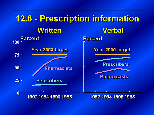 I am pleased to report on food and drug safety today and to summarize the status of our progress in reaching the Year 2000 targets established for each of the eight objectives in this priority area. Food and drug safety is truly a priority area, because this topic affects all of us in many aspects of our daily lives. Issues raised in food and drug safety are not limited to certain settings or certain groups but affect the population as a whole. Therefore, it’s critical to establish and develop systems to monitor closely these objectives. The results show that there has been substantial progress in improving both food and drug safety. Let's look first at drug safety.