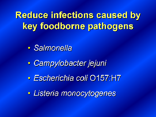 Healthy People established the objective to reduce infections caused by Salmonella, Campylobacter jejuni, E.Coli O157:H7 and Listeria moncytogenes, because of the frequency of these food-borne infections and their severity.