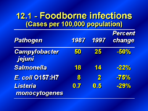 I am very pleased to report that each of these four foodborne infections has met the Year 2000 targets. Cases of campylobacter jejuni, down by 50 percent; Salmonella, down by 22 percent; E.Coli O157:H7, down by 75 percent and Listeria monocytogenes down by 29 percent. The magnitude of the problem for each is different but they all show a substantial decline. Truly remarkable progress over the past 10 years. Also noteworthy is that we have a data system capable of monitoring these diseases and documenting progress. From a decade ago when there were many reporting systems operating in this area, yet still data gaps, we now have a coordinated surveillance system, FoodNet. We'll have more details on FoodNet in following discussions but it is a strong, comprehensive system based on collaborative efforts of State and local health departments and CDC, FDA, and USDA.