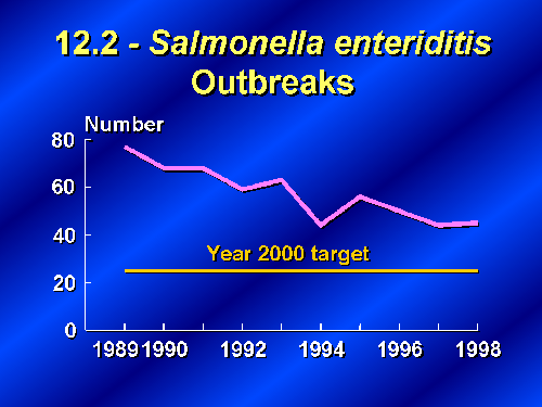 Turning from individual cases to reported outbreaks, Salmonella enteriditis infection outbreaks have declined from 77 outbreaks in 1989 to 45 in 1998. However, objective 12.2 still remains substantially above the year 2000 target of 25 outbreaks.