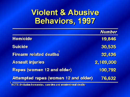 Thank you, Dr. Satcher. Today we are here to present data on some of the most disturbing of public health issues - behaviors that are violent and abusive. This includes homicide, suicide, assault, rape and child abuse. There is much encouraging news to report, but at the same time much work remains to be accomplished. In this first section, I will highlight overall findings on violence and abusive behaviors, with detailed data on homicide, rape, and partner abuse, and child abuse. Later in the program I will present data on suicide, adolescent and school violence.