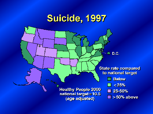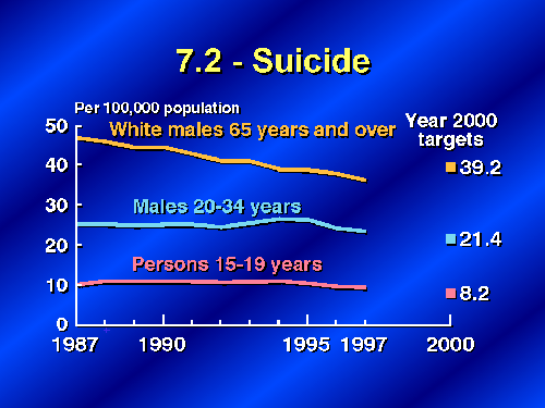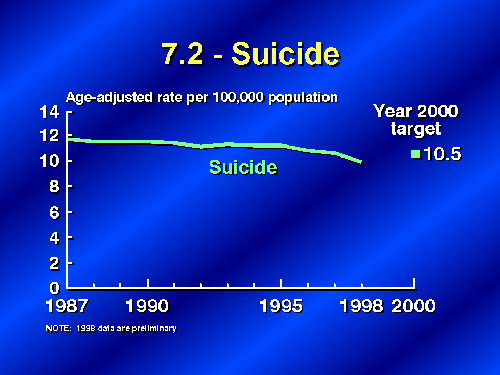 Thank you Dr. Satcher. This second section will focus on suicides, and also on violent and abusive behaviors among children and adolescents. As you've heard, suicide prevention is a major focus within the Department of Health and Human Services as witnessed by Dr. Satcher's just published report 'The Surgeon General's Call to Action to Prevent Suicide, 1999.' In fact, in the United States the rate of suicide is 50 percent higher than the homicide rate. Again, there is encouraging news to report on this objective - overall suicide rates have declined 14 percent during the past decade and, as with homicide, preliminary 1998 data indicate that the year 2000 target has been met.