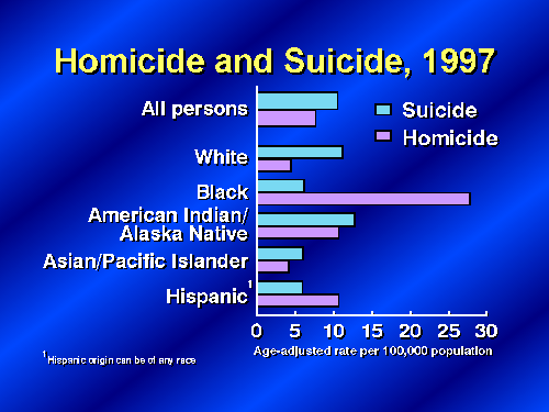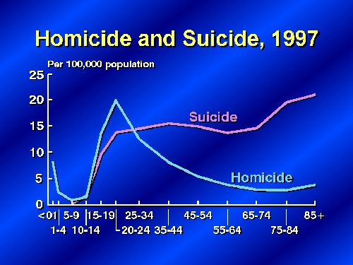 On a closing note, the events that we’re talking about today are by no means rare. There were 30,000 suicides and 20,000 homicides in 1997. That’s 50,000 deaths and one-fifth of them, which is 10,000, occurred to our young people ages 15-34. Focusing on these young people, homicide and suicide represent more deaths than from any natural cause of death. Perhaps more than any other priority area, the issues involved in these deaths cut across so many parts of people’s lives, including health, economic, social, justice, education, and housing.