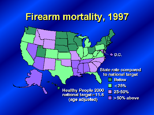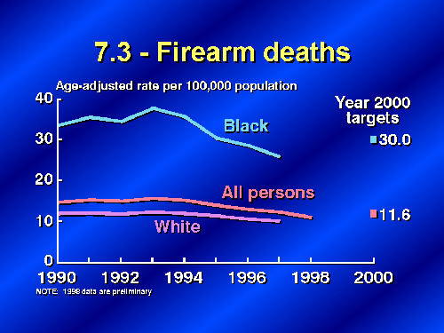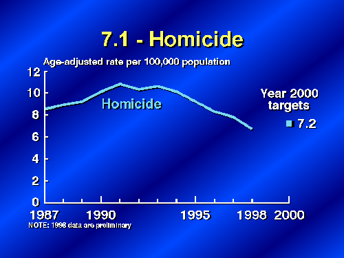 NCHS's 1998 preliminary data were released just yesterday. They suggest that the country has met the Healthy People 2000 targets for homicide, suicide, and firearm deaths. Over the decade, the homicide rate has dropped by 30 percent, suicide by 14 percent and the firearm death rate by 25 percent. The declines in homicide and firearm deaths began in 1994 and they continue, while the decline for suicide has been gradual over the entire period.