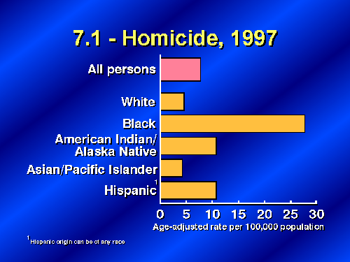 Homicide rates vary greatly by race and ethnicity. Blacks are disproportionately victims of homicide. Their rates are almost 6 times those of whites and Asians and Pacific Islanders.