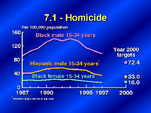 Homicide is the second leading cause of death among adolescents and young adults 15-34 years. When targets were set for Healthy People 2000 priorities, these three groups - black females, black males, and Hispanic males - were included as special population sub-objectives because they are at higher risk. For all of these groups there has been progress from the peak mid-decade years. The target for black females - the blue line -- has been met and the target for Hispanic males - the orange line - has almost been met. The rate for black males has declined sharply since 1993. Unfortunately, the rate for this group is still 10 times the homicide rate for Asian and Pacific Islander males. And, for that matter, the rate is still 30 percent above the target.