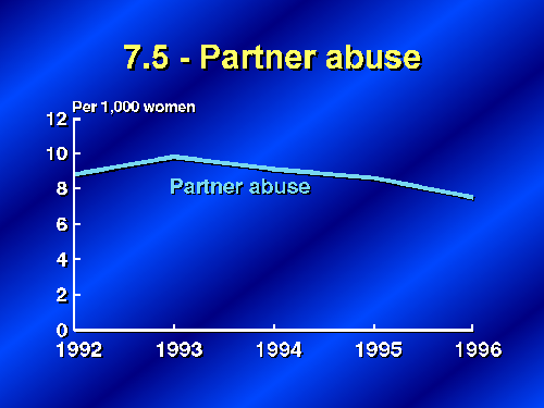 as we can see in this slide, a smaller decline of about 15 percent in partner abuse. In considering this apparent progress, we must realize that collecting these types of data pose a particularly difficult challenge. Surveys are conducted in the household where biases are likely, partially due to the potential threat of further abuse by others in the household. I am very pleased to report, however, that the Department of Justice and the Department of Health and Human Services have formed a long-term, joint effort to improve methods to measure violence against women.