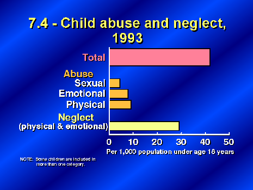 The final area of concentration is child abuse. There were about 40 reports of child abuse and neglect for every 1,000 children and adolescents in 1993. Neglect is the largest component with significant contributions by physical abuse, emotional abuse, and sexual abuse. This is another complex issue to measure, and surveillance in this area is particularly difficult. We have evidence that the number of states with child death review teams is on the rise. As these teams become more successful, we may see increases in reporting due to improved surveillance.