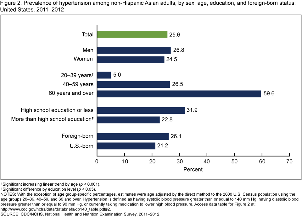 - One-quarter (25.6%) of non-Hispanic Asian adults aged 20 and over had hypertension in 2011–2012.