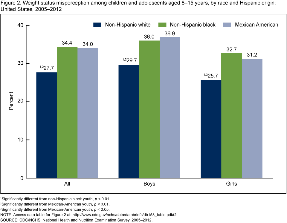 - About one-third of Mexican-American (34.0%) and non-Hispanic black (34.4%) children and adolescents misperceive their weight status compared with non-Hispanic white children and adolescents (27.7%).