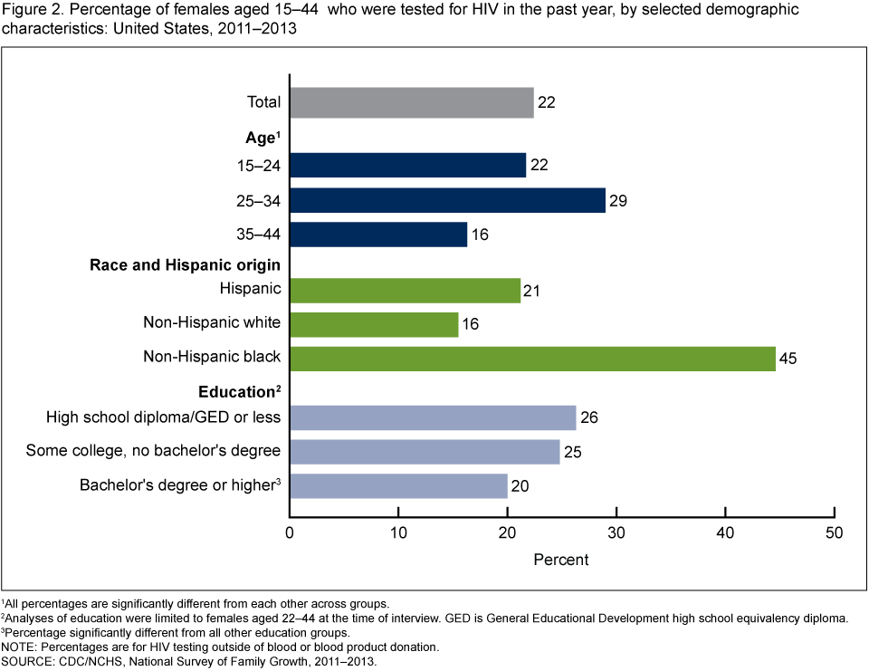 - Non-Hispanic black females were more likely to have been tested for HIV in the past year (45%) than Hispanic females (21%) or non-Hispanic white females (16%).