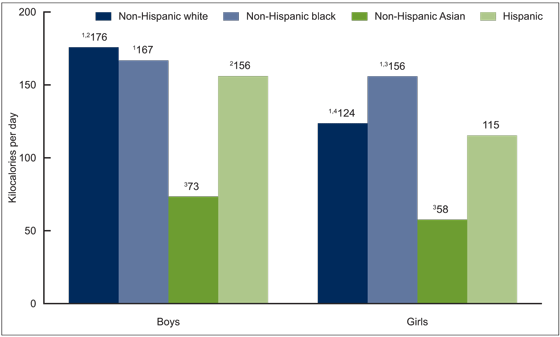 - Calories consumed from sugar-sweetened beverages differed by race and Hispanic origin for both boys and girls.