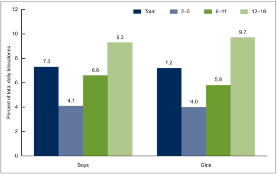 - Similarly, sugar-sweetened beverages contributed 4.0% of total daily calories consumed for girls aged 2–5, 5.8% for girls aged 6–11, and 9.7% for girls aged 12–19.